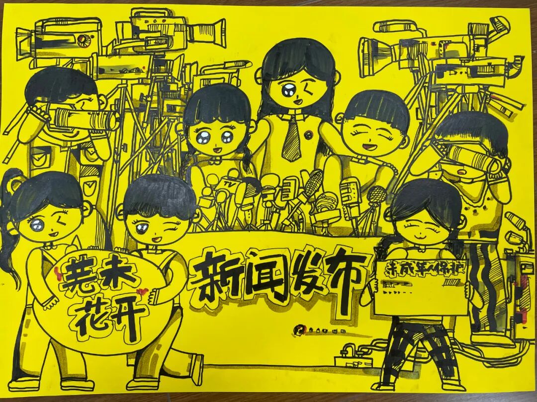 创作理念:“芜未花开”法治宣讲团是芜湖市检察机关2019年成立的普法宣讲团,宣讲团的检察官姐姐们经常为我们带来各种普法活动和法治教育。这幅作品通过“芜未花开”新闻发布会的场景,展现检察官姐姐们为小朋友带来法律知识,保护未成年人的独特风采。