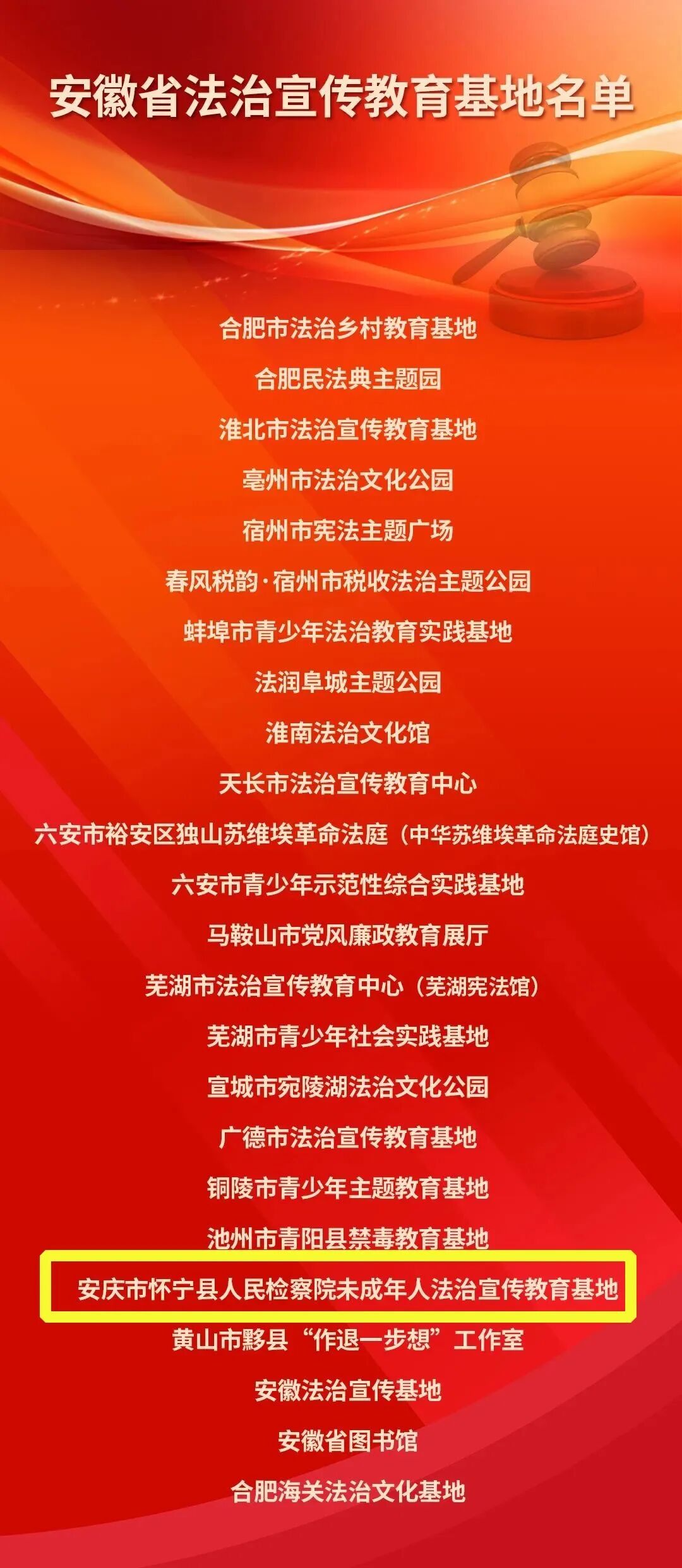 此次命名的24家安徽省法治宣传教育基地,全景式反映了我省近年来在法治宣传教育方面取得的丰硕成果,涵盖了红色基因传承、法治文化建设、基层依法治理、青少年法治宣传教育等方面的探索实践,为依托社会资源开展法治宣传教育提供了新思路、新方法和新样板。