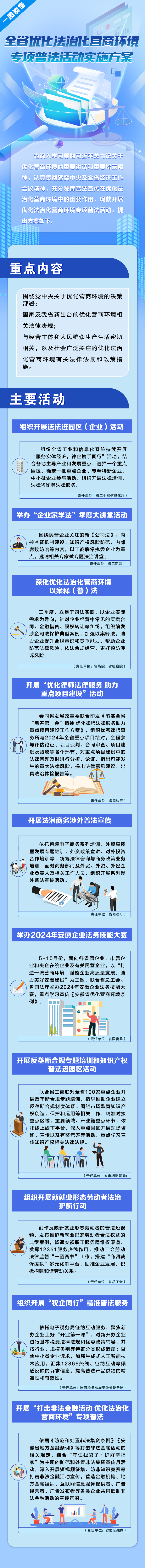 为充分发挥普法宣传在优化法治化营商环境中的重要作用,日前,安徽省法宣办会同省委金融办、省高院、省检察院、省工业和信息化厅、省司法厅、省商务厅、省国资委、省市场监管局、省总工会、省工商联、省税务局等12家部门,联合印发《全省优化法治化营商环境专项普法活动实施方案》,围绕与企业经营管理密切相关的法律法规,在全省部署开展优化法治化营商环境专项普法活动。