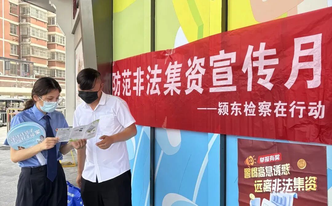 6月14日,阜阳市颍东区检察院干警在颍东区幸福路开展防范非法集资宣传活动。